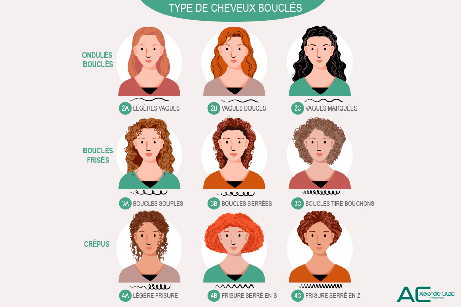 - Type 3 (Boucles) : Le type 3 englobe des boucles plus prononcées, allant des boucles en ressort du type 3a aux boucles en tire-bouchon du type 3c.